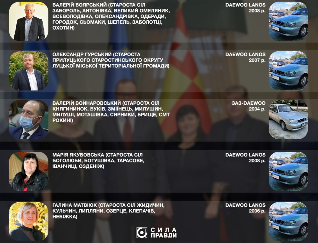 Автомобілі для службових поїздок мають і старости Луцької міської територіальної громади. Валерій Боярський та Марія Якубовська користуються автівками «Daewoo Lanos» 2008-го року випуску, Олександр Гурський – 2007-го, Галина Матвіюк – 2006-го. А Валерій Войнаровський їздить на «ЗАЗ-Daewoo» 2004-го року випуску.