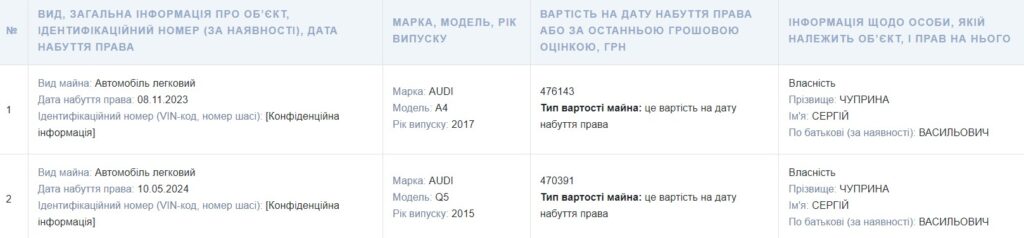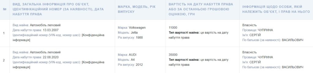 Цікаво, що за декларацією про 2022 рік, у Сергія Чуприни були 2 автівки, придбані за смішною ціною. Він декларував Audi A4 2012 року випуску, яку придбав у 2020-му за… 35 тисяч гривень. А також повідомив про Volkswagen Jetta 1988-го року, куплений ще раніше за ціною електросамоката – 11 тисяч гривень.