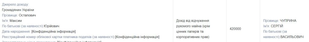 І, як видається, не тільки цю: у 2024 році Volkswagen Jetta теж зник зі списку рухомого майна Чуприни. Натомість його дружина, яка, за декларацією Чуприни, не мала рухомого майна, отримала 200 тисяч гривень доходу від продажу саме цього виду власності.