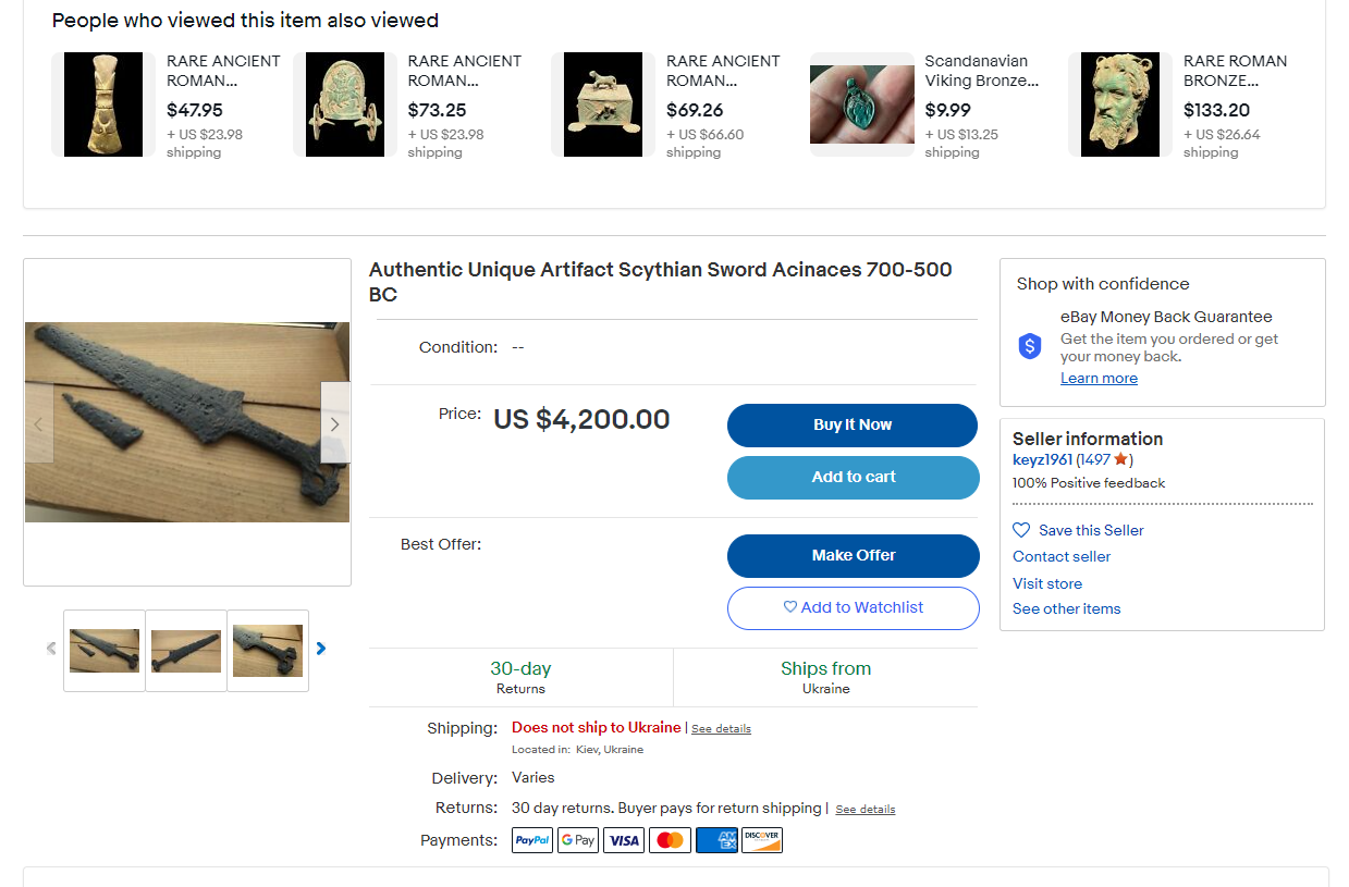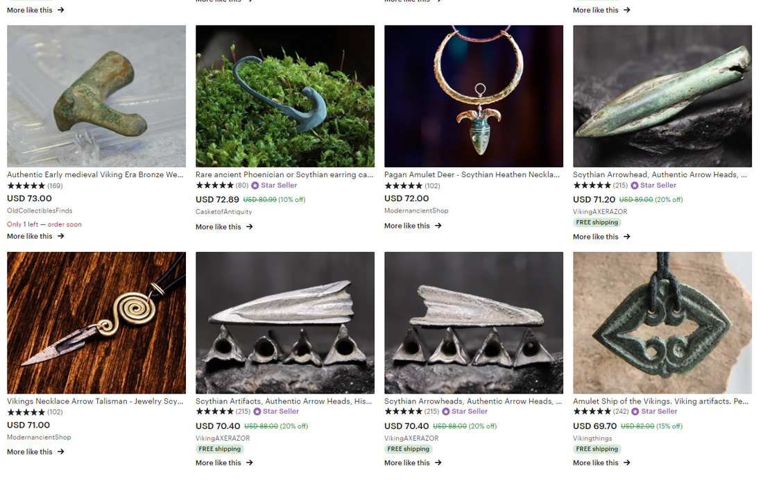 На іншому американському сайті продаються близько сотні скіфських прикрас та предметів побуту. Ціна варіюється від п’ятисот гривень до 10 тисяч.