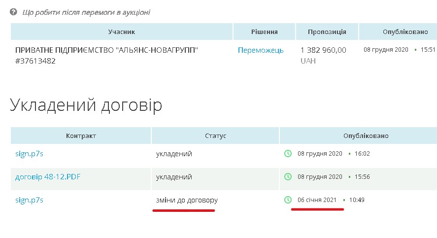 Але і тут є одна деталь – укладений із підрядником договір не містить пунктів щодо зберігання товару у постачальника. Водночас, у системі не оприлюднено договору №1 щодо цієї закупівлі. А 6 січня в оголошенні цієї закупівлі з’явилося повідомлення про зміни до договору, однак жодних документів із цими змінами не завантажили крім цифрового підпису.