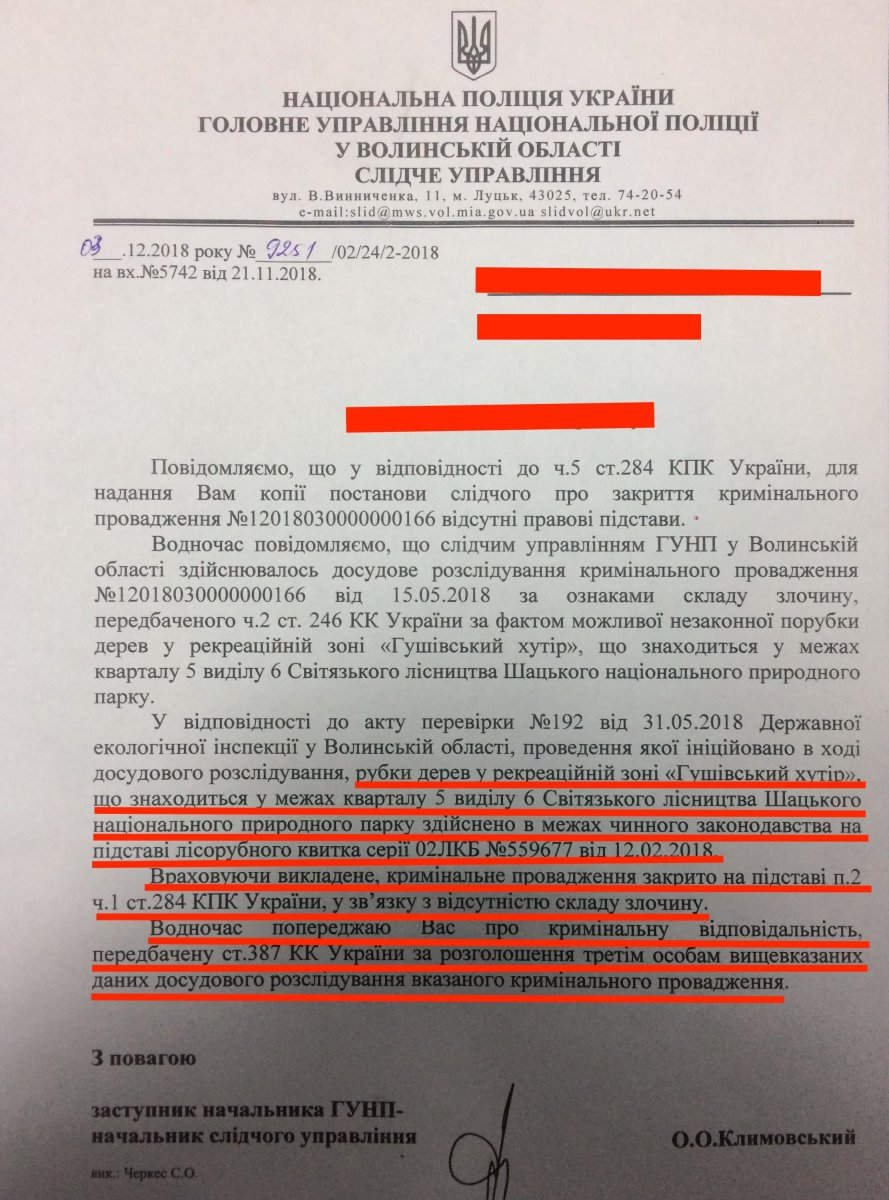 Всі документальні підтвердження і пояснення були долучені до матеріалів справи. Натомість дане кримінальне провадження «ходило» від слідчого до слідчого. Спочатку співробітники Головного управління Національної поліції у Волинській області просили журналістів про допомогу і співпрацю у розслідуванні, а згодом контакт чомусь різко обірвався. На запитання «Сили правди» про те, закрито чи ні кримінальне провадження, відповіли, що не мають права це розголошувати. А от активістам відповіли, щоправда наголосивши, що це не для широкого загалу. Для чого така секретність стає зрозумілим зі змісту документу. Відсутність складу злочину в поліції обгрунтовують самою лише наявністю лісорубного квитка. Ось як виявляється все просто.