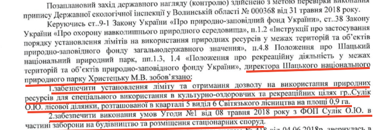 Хоча згодом Марія Христецька у відповідь на журналістський запит надіслала копію угоди між ШНПП і ФОП Сулік нібито від 8 травня 2018 року. Документом передбачалося використання природних ресурсів у кварталі 5 виділ 6 Світязького лісництва підприємицею без вилучення у постійного користувача. Олена Сулік обіцяла не втручатися в екосистему та не зводити капітальних споруд. Проте вийшло з точністю до навпаки.