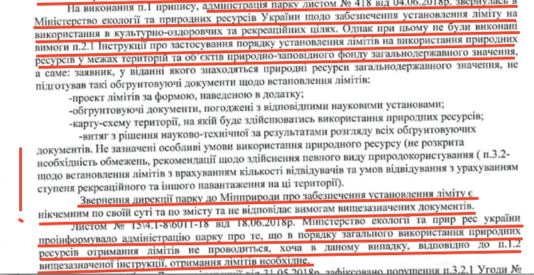 «Звернення дирекції парку до Мінприроди про встановлення ліміту є нікчемним по своїй суті та змісту і не відповідає вимогам», – йдеться в акті перевірки.