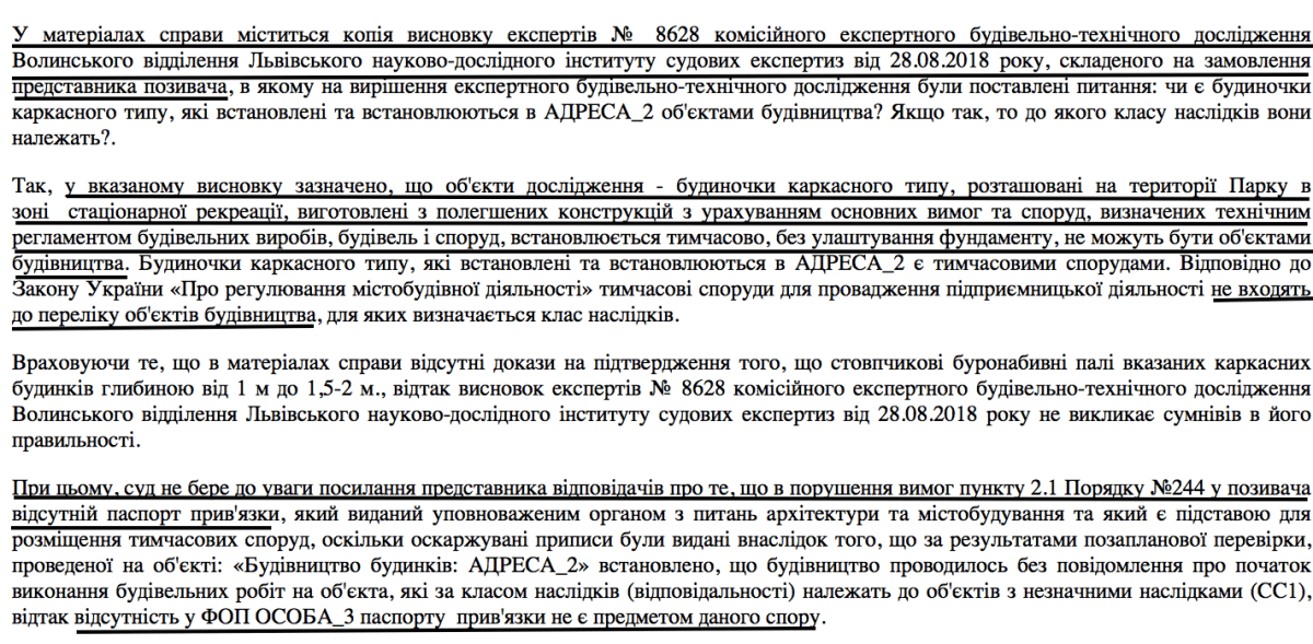 А тим часом – правосуддя в поміч. Волинський окружний адмінсуд в особі судді Оксани Андрусенко визнав протиправними і скасував приписи Держархбудінспекції обгрунтувавши рішення результатами фахової експертизи проведеної на замовлення підприємиці Сулік. Волинське відділення Львівського науково-дослідного інституту судових експертиз зробило висновок, що будинки є тимчасовими спорудами.