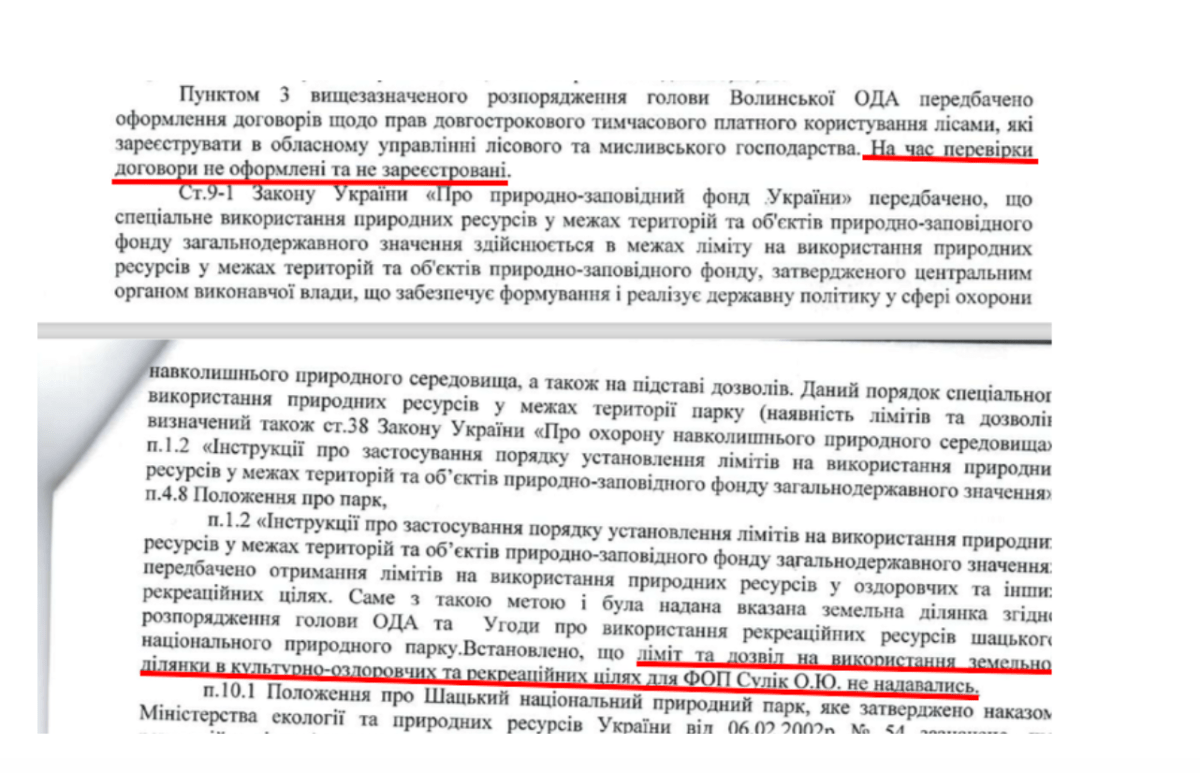 Перша невідповідність, яку встановили «ревізори» полягала у тому, що згідно розпорядження голови ОДА, підприємиці Олені Сулік надали у довгострокове користування лісоділянку на території наметового містечка «Незабудка», а Гушівський хутір – її тітці, вчительці із Любомля Вірі Шереметі. На час проведення перевірки будинки у Гушівському хуторі вже зводились на замовлення Олени Сулік, а не Віри Шеремети. Угоди, як йдеться в акті перевірки від 31 травня 2018 року, теж не були оформлені та зареєстровані.