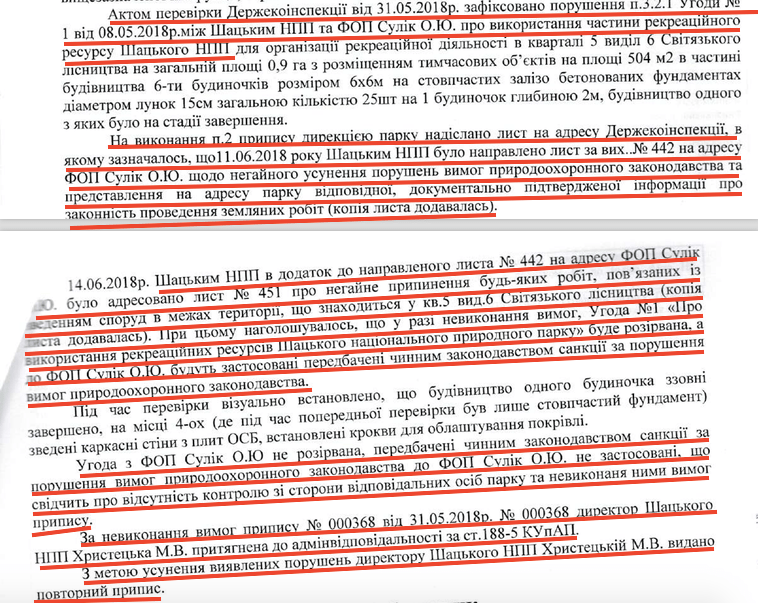 Нагадаємо, у березні 2018 року розпорядженням голови Волинської ОДА Володимира Гунчика дві лісоділянки на території Шацького національного природного парку (загальною площею 2 га) передали у довгострокове користування на 25 років двом мешканкам Любомля: вчительці місцевої школи Вірі Шереметі та її племінниці Олені Сулік. Тоді, на початку «співпраці» Марія Христецька запевняла, що змушена залучати бізнес заради інвестицій і розвитку парку. Однак, як того й треба було очікувати, на одній із заповідних територій почала виростати приватна турбаза.
