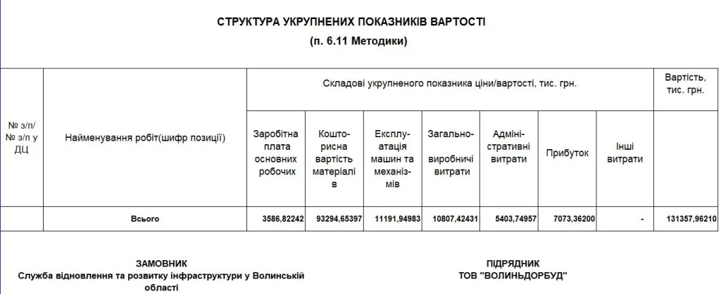 Що ж до цін на матеріальні ресурси, то в тендерних документах є список із вартістю основних дорожньо-будівельних матеріалів, підписаний і підрядником, і замовником. У документі вказані ціни згідно з даними Служб автодоріг в областях, зокрема і Волинської, станом на певний місяць. Загалом підрядник засвідчив, що левову частку грошей – понад 93 мільйони – витратить на матеріали. Свій прибуток Волиньдорбуд оцінив у 7 мільйонів.