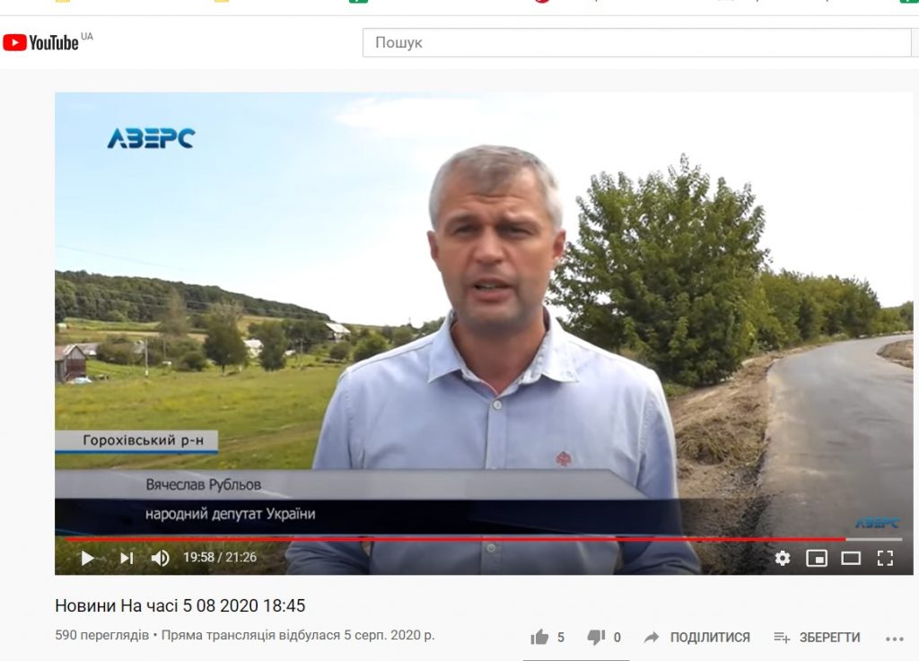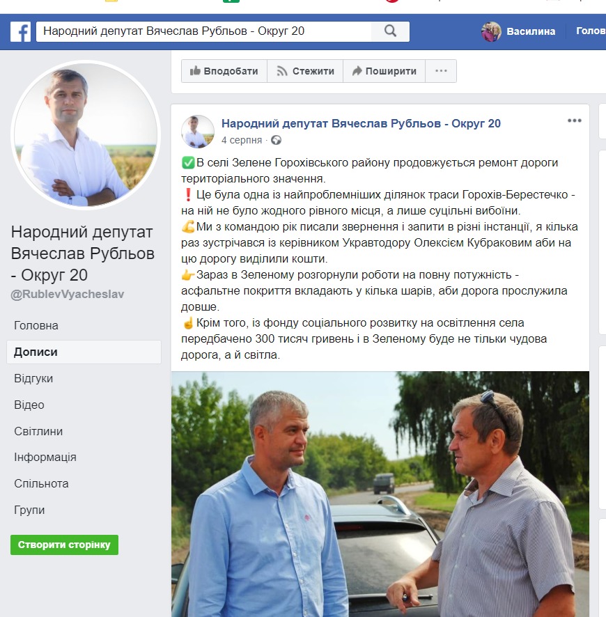 4 серпня на Facebook-сторінці «Народний депутат Вячеслав Рубльов – Округ 20» повідомили про участь нардепа в отриманні коштів на ремонт дороги поблизу села Зелене Горохівського району.