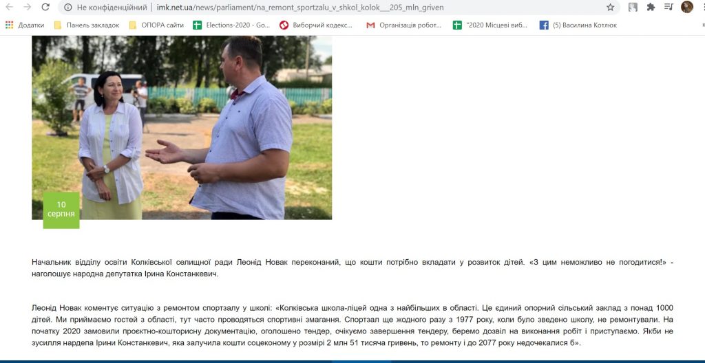 10 серпня на сайті «Ірина Констанкевич — народний депутат» з’явилася публікація «На ремонт спортзалу в школі Колок – 2,05 млн гривень». У ній начальник відділу освіти Колківської селищної ради Леонід Новак зазначає:
