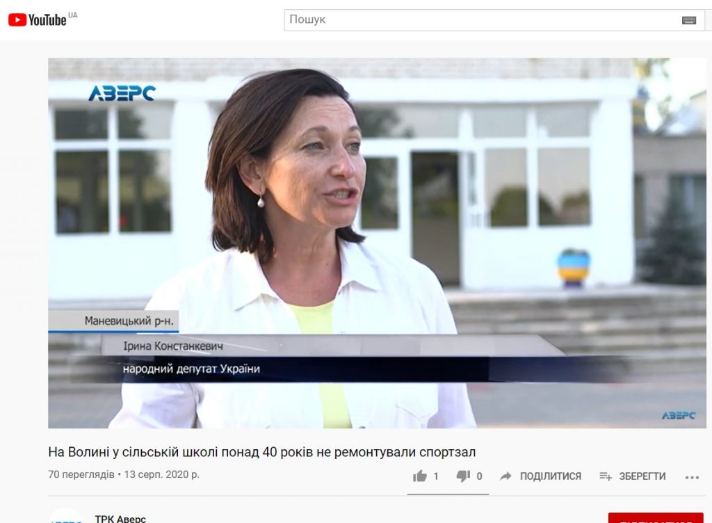 «У тому, щоб кошти на ремонт спортзалу – а це понад 2 млн грн, посприяла депутат Ірина Констанкевич», – повідомляють у сюжеті та далі цитують депутатку.