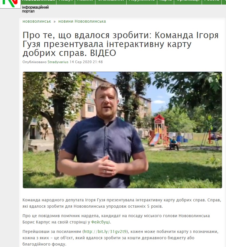14 серпня сайт «Нововолинський інформаційний портал» розмістив публікацію «Про те, що вдалося зробити: Команда Ігоря Гузя презентувала інтерактивну карту добрих справ. ВІДЕО». Матеріал із посиланням на сторінку потенційного кандидата на посаду міського голови Нововолинська Бориса Карпуса повідомляє про сайт, на якому можна переглянути «карту добрих справ».