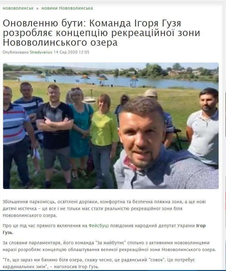 Також 15 серпня «Нововолинський інформаційний портал» розмістив новину «Оновленню бути: Команда Ігоря Гузя розробляє концепцію рекреаційної зони Нововолинського озера». У матеріалі, окрім планів щодо відновлення відпочинкової зони, розмістили відео із Facebook-сторінки народного депутата «Ігор Гузь – офіційна сторінка», у якому депутат розповідає, що команда «За майбутнє» працює над розробкою концепції облаштування рекреаційної зони міського озера. Демонструючи на відео водойму, у кадр потрапляє дитячий майданчик.