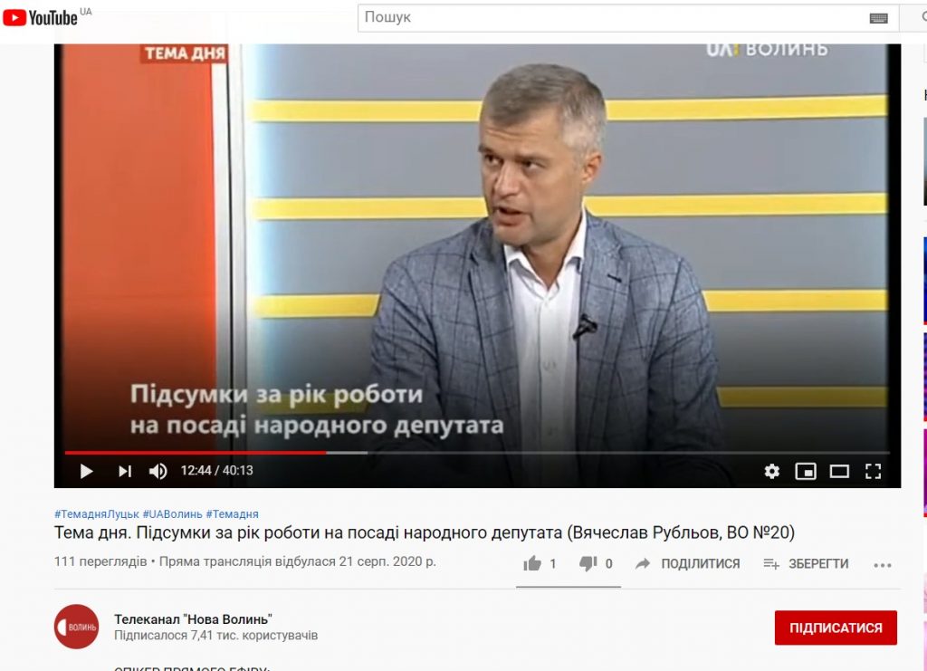 21 серпня в ефірі «Суспільного Волинь» вийшла програма «Тема дня. Підсумки за рік роботи на посаді народного депутата (Вячеслав Рубльов, ВО №20). Депутат, поза іншим, розповідає, про залучені кошти державного бюджету.