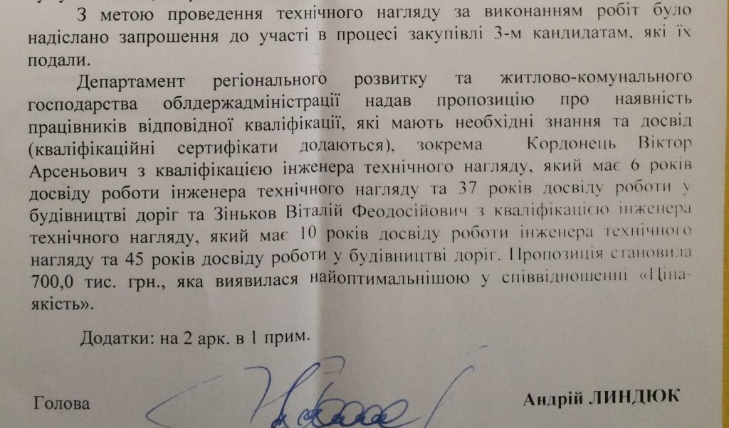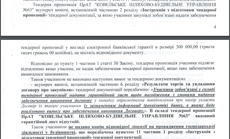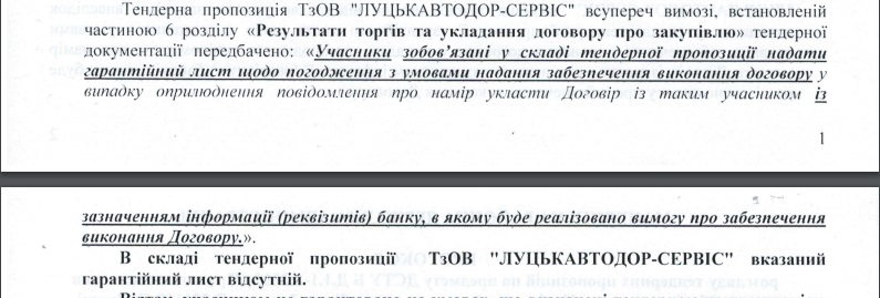 При цьому обох учасників відхилили: у «Луцькавтодор-сервіс» був відсутній гарантійний лист, а «Ковельське ШБУ-63» не надало гарантійного листа, копії ліцензії та банківської гарантії у розмірі 300 000 грн.! (Запам’ятаймо цей момент)