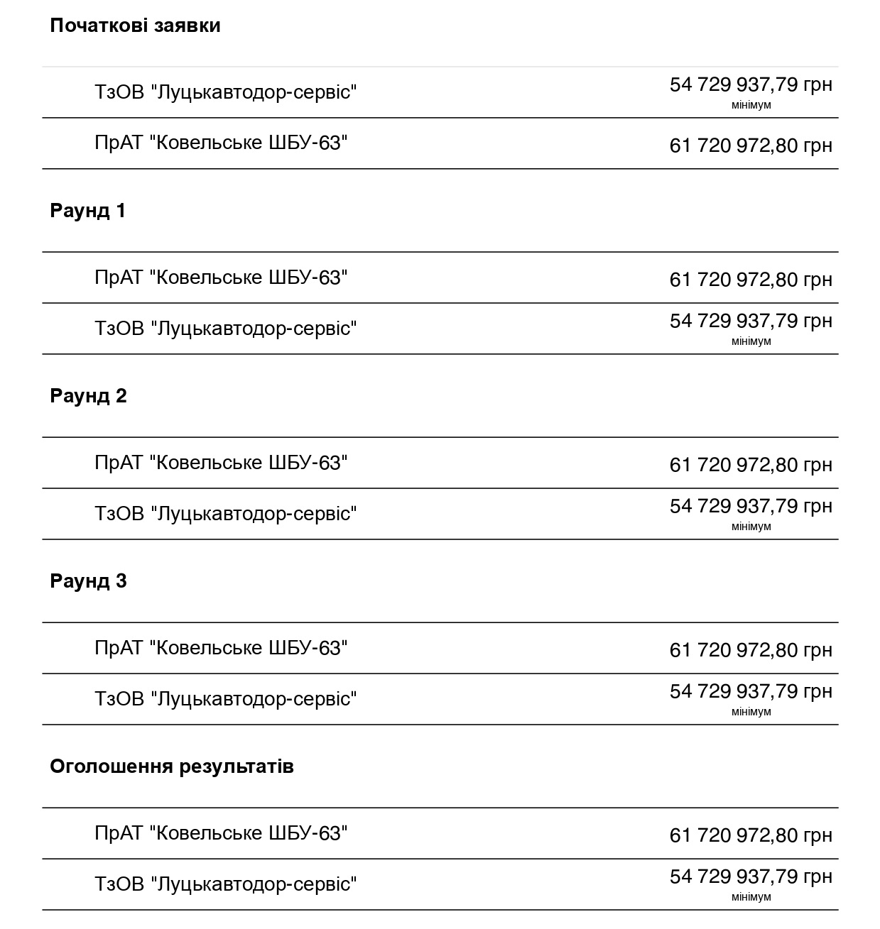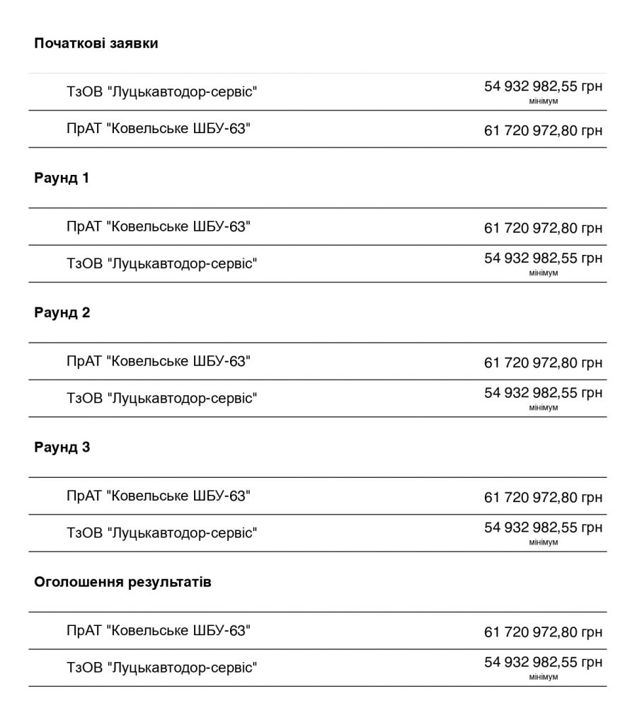 Так і сталось. У другому тендері участь взяли все ті ж два учасники – ТзОВ «Луцькавтодор-сервіс» і ПрАТ «Ковельське ШБУ-63», чиї пропозиції знову не змінились протягом аукціону ані на йоту.
