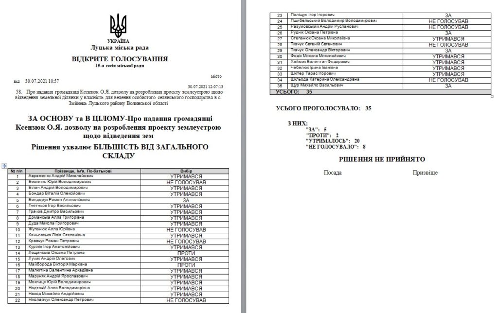Це відбулося у червні цього року, а вже у липні проєкт рішення про видачу землі дружині судді знову винесли на сесію, тепер уже Луцької міської ради. Однак і ці депутати не підтримали його своїми голосами. З 35 присутніх –лише п’ять «за». До речі, «За» проголосував міський голова Ігор Поліщук.