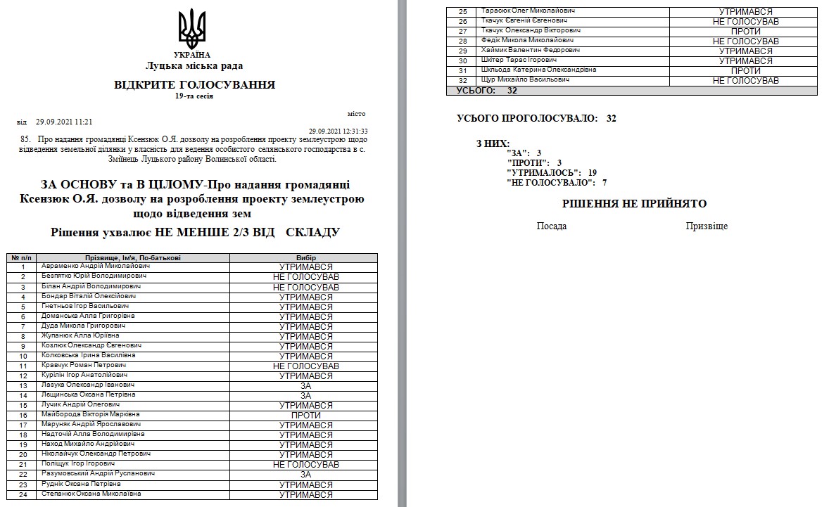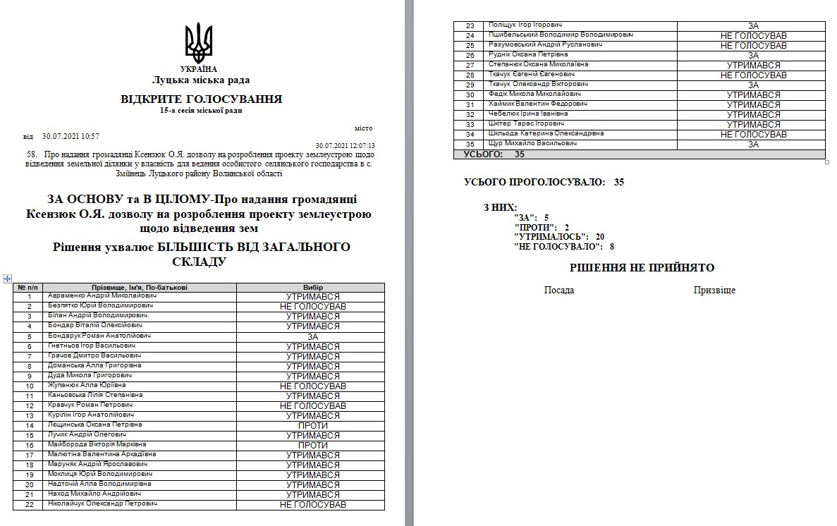 «Зі змісту витягу пленарного засідання 15 сесії Луцької міської ради VIII скликання від 30.07.2021 вбачається, що під час обговорення питання про прийняття проекту рішення «Про надання громадянці Олені Ксензюк дозволу на розроблення проекту землеустрою щодо відведення земельної ділянки у власність для ведення особистого селянського господарства в с. Зміїнець Луцького району Волинської області» в депутатів Луцької міської ради не виникло будь-яких питань чи заперечень щодо вказаного рішення, однак за результатами голосування рішення не прийнято, що свідчить про відсутність будь-яких обґрунтованих причин щодо неприйняття рішення.