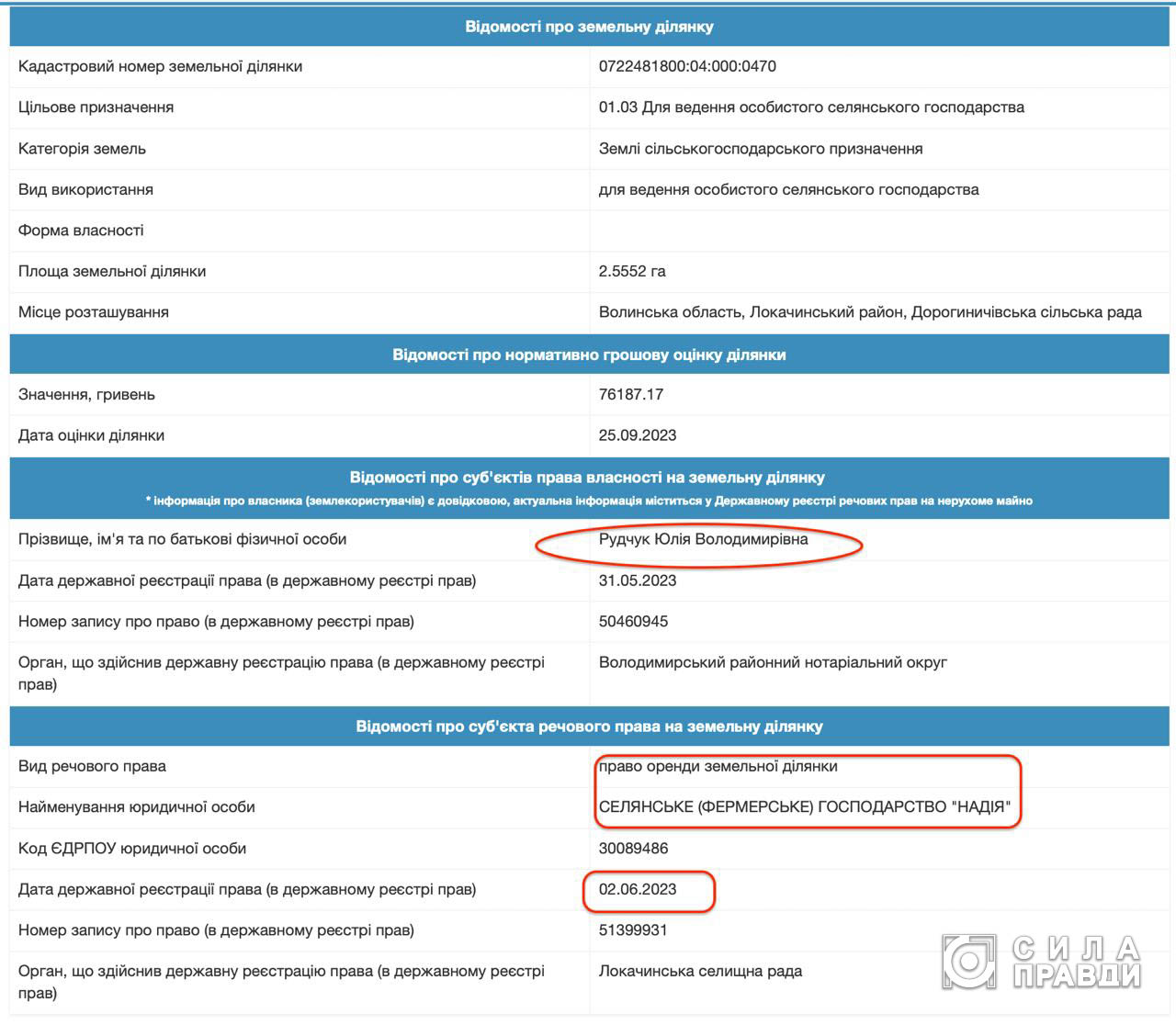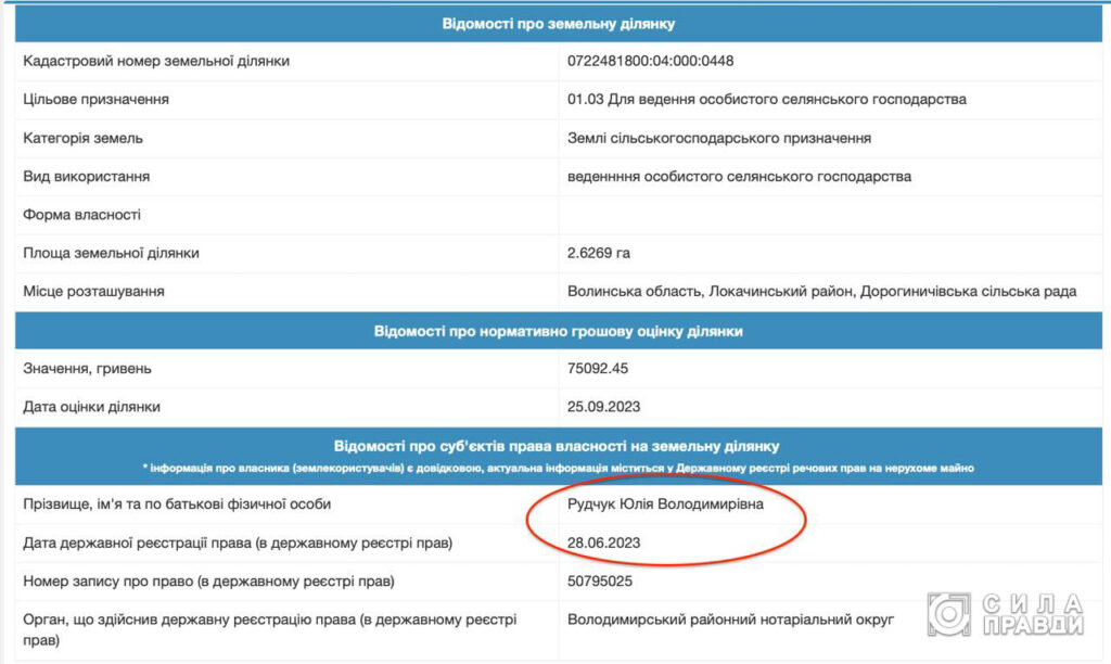 Поки готувалась ця публікація Центр журналістських розслідувань «Сила правди» з’ясував, що земельні ділянки, щодо яких тривають суди, Оксані Бабійчук не належать. Кілька місяців тому у паїв зявилася нова власниця – Юлія Рудчук. Окрім того, згідно з інформацією з Державного земельного кадастру, у вересні вона здала одну з ділянок в оренду місцевому фермерському господарству «Надія».