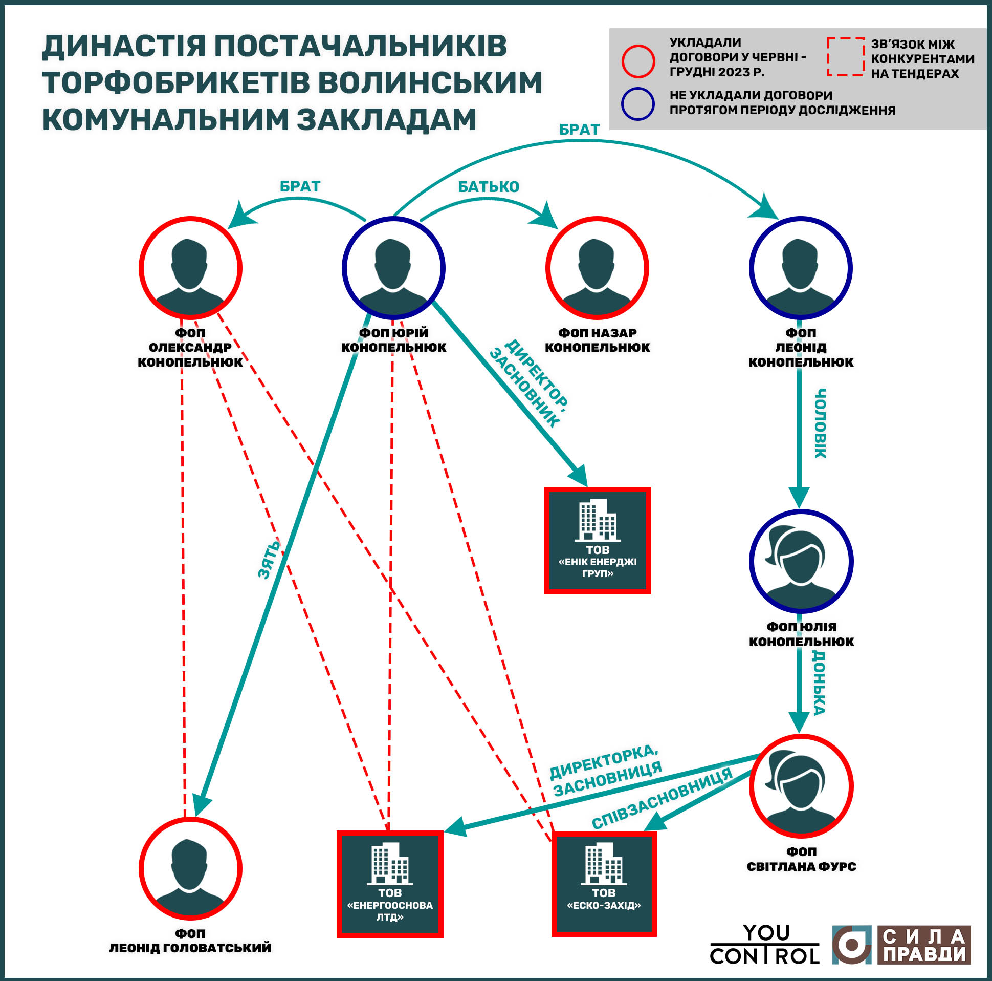 Загалом у другому півріччі 2023 року комунальні заклади й установи Волині закупили торфобрикетів на понад 58 мільйонів гривень. Династія постачальників палива, що пов’язує родину Конопельнюків, підприємців Фурс та Головатського, на торфобрикетах за червень-грудень 2023-го отримала четверту частину від загальної суми договорів – 13,5 мільйонів гривень. Хоч у закупівлях волинськими комунальними установами торфобрикетів аж надто завищених цін немає, та все ж середньоринкова вартість не стала аксіомою для всіх.