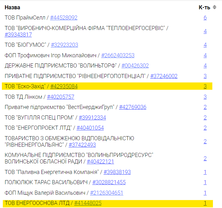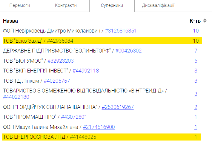 Неодноразово в аналізованих закупівлях торфобрикетів простежується зв’язок між постачальниками. Приміром, одна і та ж особа отримує підряди і як підприємець, і як власник компанії. А інколи договори на постачання товару укладаються з цілою династією підприємців.