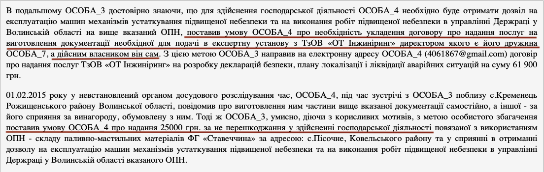 За надання свідоцтва про реєстрацію об’єкта підвищеної небезпеки – заправної станції на території сільгосппідприємства – чиновник заправив службове авто і набрав каністру пального про запас. Потім він запропонував підприємцеві звернутися для подальшого виготовлення документів до ТзОВ «ОТ Інжиніринг», формальним керівником якого була дружина Осипенка Тетяна, а фактичним власником сам держслужбовець.