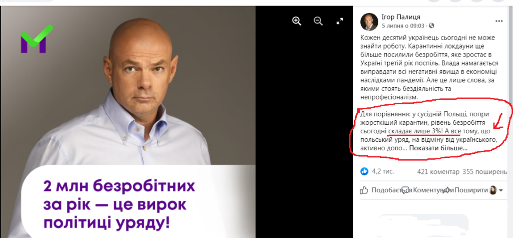 Сайт ІА «Волинські новини» поширив думку народного депутата України, лідера партії «За Майбутнє» Ігоря Палиці про рівень безробіття. Цей текст має ознаки замовності, крім того, містить маніпуляцію. Медіа посилається на сторінку політика у соцмережі Facebook. Як з’ясував проект «Infocrime Lutsk», там з’явилося неправдиве твердження: «Для порівняння: у сусідній Польщі, попри жорсткіший карантин, рівень безробіття сьогодні складає лише 3%!». Насправді, за офіційними даними управління статистики Польщі, на сьогодні за найновішими даними (станом на червень 2021 року, – авт.) рівень безробіття у Польщі становить 5,9%.