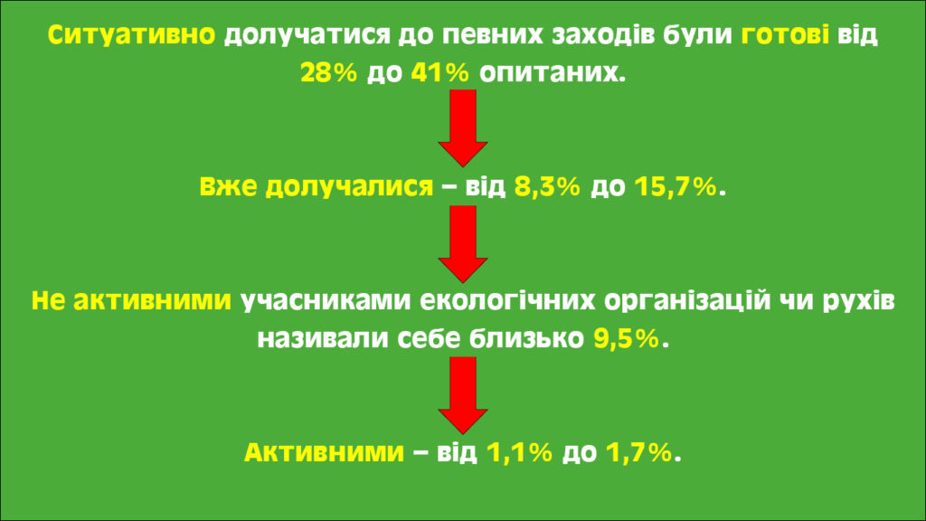 Отже, ми бачимо спадну тенденцію у переході від частки українців, що незадоволені роботою органів влади у галузі екології та захисту довкілля до частки тих, хто готовий постійно та колективно діяти для вирішення таких проблем і покращення ситуації. До 82,7% були частково або повністю незадоволеними діями влади у цій галузі, близько 30-40% відзначали можливість особисто долучитися до вирішення екологічних проблем, близько 10-15% ситуативно проявляли певну активність, зокрема в рамках колективних заходів екологічних об’єднань, а стабільними їх членами називали себе 1-2% опитаних. При цьому також варто відзначити суттєво меншу довіру опитаних до партій проекологічного спрямування порівняно із природоохоронними громадськими організаціями (3% проти 22%).