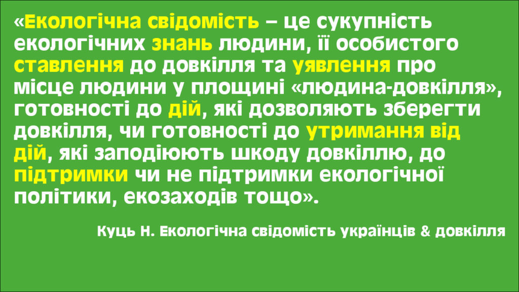 Авторка аналітичного документу “Екологічна свідомість українців & довкілля” Н.Куць наводить таке визначення екологічної свідомості: “Екологічна свідомість – це сукупність екологічних знань людини, її особистого ставлення до довкілля та уявлення про місце людини у площині “людина-довкілля”, готовності до дій, які дозволяють зберегти довкілля, чи готовності до утримання від дій, які заподіюють шкоду довкіллю, до підтримки чи не підтримки екологічної політики, екозаходів тощо”. В цьому контексті нас найбільше цікавить частка опитаних у соціологічних дослідженнях, які тим чи іншим чином готові до колективних та публічних дій, щоб вплинути на дії органів влади та місцевого самоврядування в екологічній сфері, а також роботи у партійних структурах, щоб забезпечити прихід партії до влади і втілення відповідної екологічної політики.