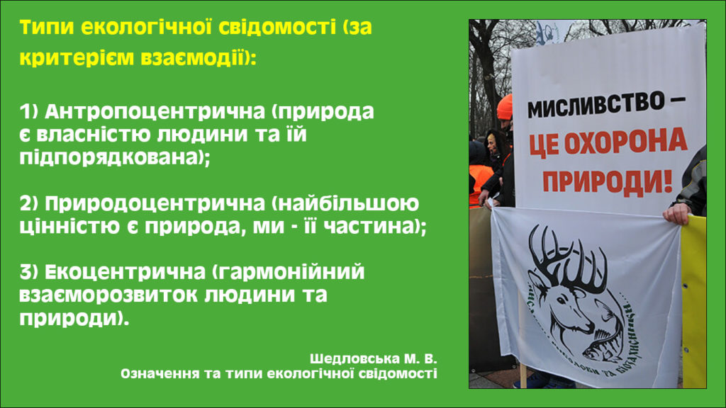 М.В.Шедловська наводить типологію екологічної свідомості у кількох вимірах. За критерієм взаємодії “людина-природа” дослідниця вказує розподіл на антропоцентричну (природа є власністю людини та їй підпорядкована), природоцентричну (найбільшою цінністю є природа, а людина повинна іти на жертви для її збереження та бути інтегрованою в природу) і екоцентричну (гармонійний взаєморозвиток людини та природи). Серед наведених типів екологічної свідомості лише природоцентричний та екоцентричний відповідають засадам екологічної ідеології у політичному та суспільному вимірі. Щоб встановити це, за “еталонні” програмні документи, які описують екологічну ідеологію, ми беремо маніфести об’єднання The Global Greens, яке декларує те, що налічує 81 повноправну екологічну організацію та рух, а також 12 асоціативних членів і 3 кандидати із різних країн. Зокрема до цього об’єднання входять найуспішніші з точки зору результатів на виборах екологічні партії світу.