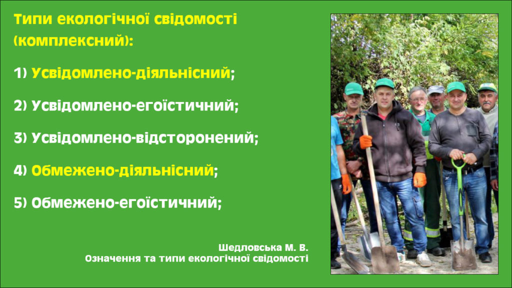 Також ми погоджуємося із М.В. Шедловською, що більш повно різноманітність типів екологічної свідомості відображає розподіл на усвідомлено-діяльнісний, усвідомлено-егоїстичний, усвідомлено-відсторонений, обмежено-діяльнісний та обмежено-егоїстичний. В даному випадку важливими для нашого дослідження є вимір частки представників усвідомлено-діяльнісного та обмежено-діяльнісного типів, адже важливими передумовами участі у роботи партії чи громадського об’єднання є позитивне сприйняття їх поглядів та ідей, а також готовність до певних дій в рамках роботи таких структур.