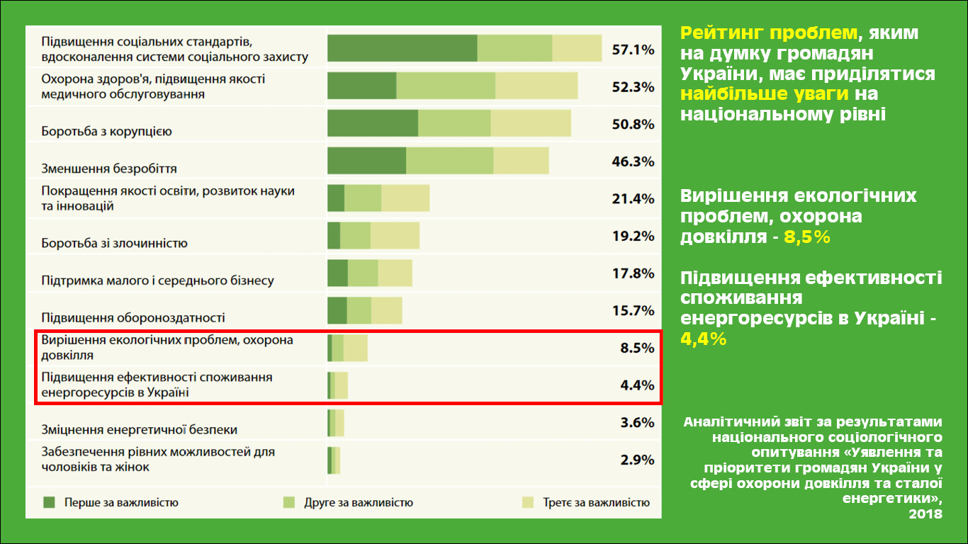 Аналітичний документ “Екологічний портрет громадянина України: порівняння з ЄС та рекомендації”, підготовлений ресурсно-аналітичним центром “Суспільство та довкілля” у 2018 році, показує, що політичним партіям, що займають проекологічну позицію, довіряють найбільше з екологічних питань 3% опитаних, а природоохоронним громадським організаціям – 22%. При цьому вищий за громадські організації рівень довіри в даному аспекті тільки до науковців – 29%. Цікаво, що станом на 2018 рік, 59% опитаних погодилися із твердженням, що вони особисто можуть відігравати роль у захисті довкілля. Ще 28% радше погодились із таким твердженням. При цьому 53% респондентів відповіли, що громадяни роблять недостатньо для збереження довкілля. Якщо поглянути на оцінку роботи влади в сфері екології, 62% опитаних вважали, що місцева влада робить недостатньо для охорони довкілля. Ще більше (66%) вважали, що уряд (центральна влада) робить недостатньо.