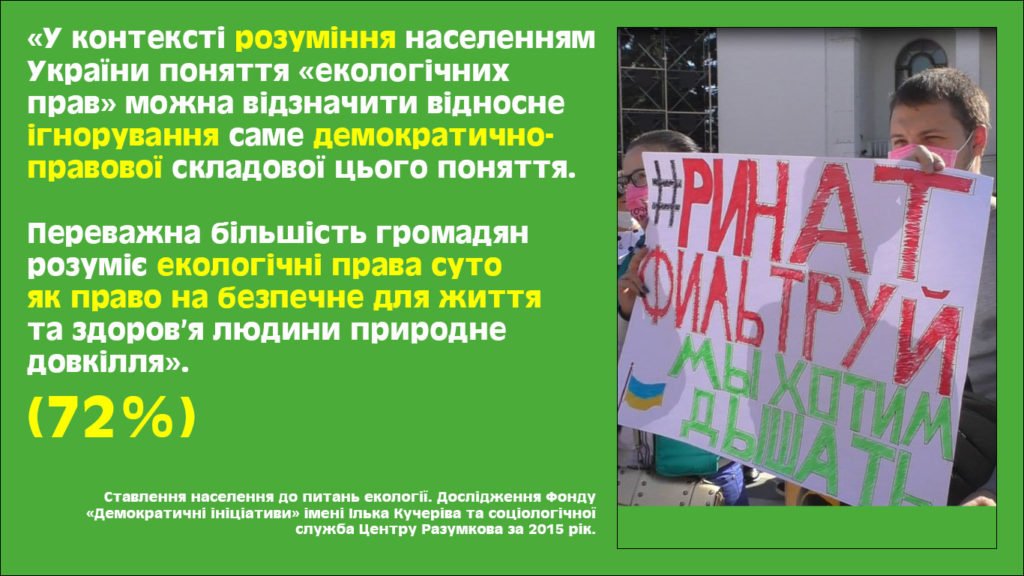 У дослідженнях щодо ставлення населення України до питань охорони довкілля проведених у 2015 та 2016 роках Фондом “Демократичні ініціативи” імені Ілька Кучеріва та соціологічною службою Центру Разумкова, відзначають, що “в контексті розуміння населенням України поняття “екологічних прав” можна відзначити відносне ігнорування саме демократично-правової складової цього поняття”. Наприклад, такий інструмент як “участь людей в обговоренні питань щодо будівництва і реконструкції об’єктів, які можуть впливати на стан навколишнього природного середовища, внесення пропозицій до органів державної влади” вважали своїм екологічним правом 31,2% респондентів у 2015 році та 34% у 2016-у. “Об’єднання людей в громадські природоохоронні організації” відзначили 21,4% та 23,1% відповідно. Також менше 50% опитаних включили до екологічних прав участь людей в розробці та здійсненні заходів щодо охорони навколишнього природного середовища, раціонального використання природних ресурсів, вільний доступ до правдивої інформації про стан навколишнього природного середовища, вільний доступ до одержання екологічної освіти та знань, право подання до суду позовів про відшкодування шкоди, заподіяної їх здоров’ю та майну внаслідок негативного впливу на навколишнє природне середовище, право на оскарження у судовому порядку рішень, дій або бездіяльності органів влади та посадових осіб щодо порушення екологічних прав громадян. Водночас єдиним екологічним правом, яке відзначили більшість респондентів (71,6% у 2015-у та 67% у 2016-у), є право на “безпечне для життя та здоров’я людини навколишнє природне середовище”, тобто право, яке не є прямо пов’язаним із будь-якою активністю в цій галузі.