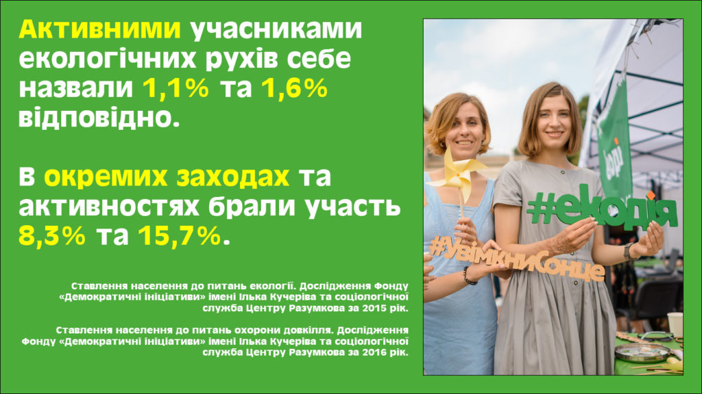 Також в рамках цих досліджень респондентам поставили запитання: “Куди Ви будете звертатися, якщо буде порушене Ваше право на здорове та безпечне довкілля?”. Готовність звернутися до громадської організації висловили 11,4% та 14,4% відповідно, до депутата місцевої ради – 11,1% і 10,7%, а до депутата Верховної Ради. – 5,9% та 5,8%. Активними учасниками екологічних рухів себе назвали 1,1% та 1,6% відповідно. В окремих заходах та активностях брали участь 8,3% та 15,7%. Варто відзначити, що варіанти відповідей у питаннях дещо відрізнялися у різні роки. Зокрема в 2016 році 28,4% опитаних відзначили, що не є учасниками екологічних рухів, проте хотіли б долучитися. Ще 54% не бажали долучатися, “оскільки це не ефективно”. У 2015 році подібного розподілу варіантів для тих, хто не долучався до рухів, не було.