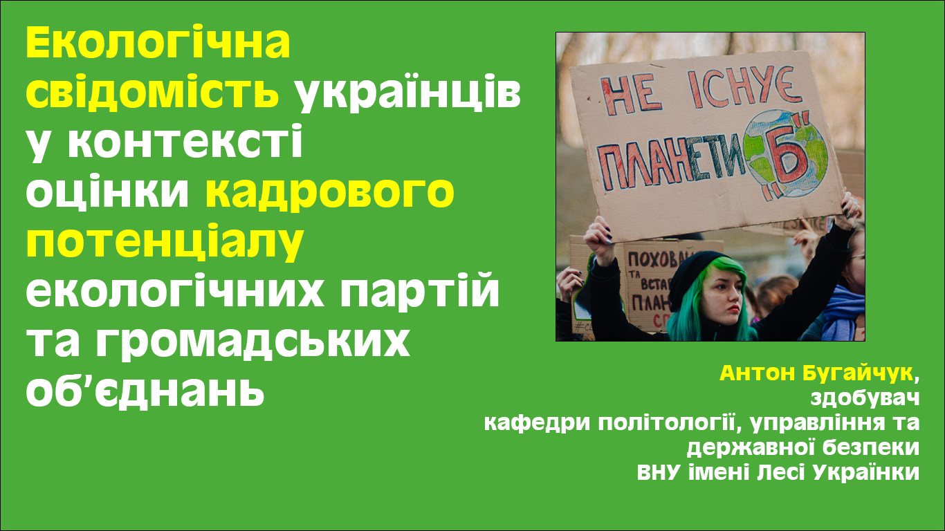 Цей матеріал присвячений порівнянню даних соціологічних досліджень, що стосуються екологічної свідомості українців, на предмет виокремлення та порівняння кількісних показників, які окреслюють частку суспільства, готову брати участь у роботі екологічних партій та екологічних громадських об’єднань. При цьому варто зазначити, що не тільки позиції у питаннях, які стосуються взаємодії “людина-довкілля”, визначають схильністю громадян долучатися до екологічних об’єднань та рухів. Отже, вимір екологічної свідомості є лише одним із компонентів для встановлення їх кадрового потенціалу в українському суспільстві. Тим не менш, він є одним із ключових, адже питання, що стосуються екологічної політики та екології загалом, є системоутворюючими для ідеологічного фундаменту екологічних партій та об’єднань.