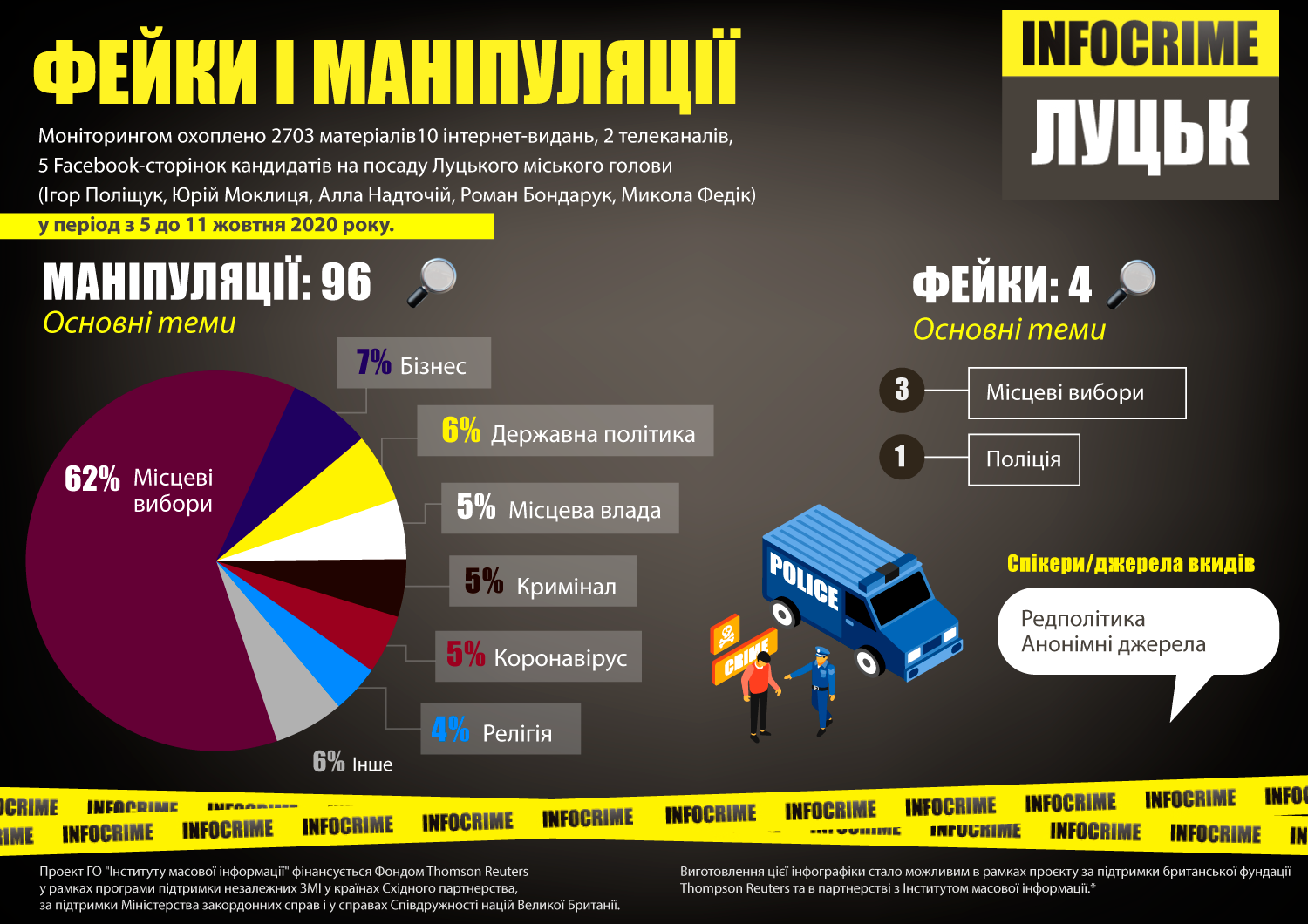 Під час моніторингу, що тривав впродовж 5-11 жовтня, проаналізовано 2703 матеріалів у 10 інтернет-видань та 2 телеканалів. Також аналізувались п’ять сторінок у Facebook кандидатів на посаду Луцького міського голови. Серед них – Ігор Поліщук, Юрій Моклиця, Алла Надточій, Роман Бондарук, Микола Федік.