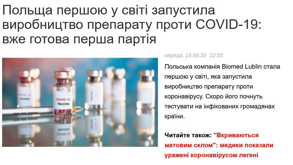 Зокрема, у заголовку «Польща першою у світі запустила виробництво препарату проти COVID-19: вже готова перша партія» поширена неправда. Журналісти пишуть, що у Польщі першими в світі почали випускати якийсь препарат від коронавірусу. Проте там немає назви препарату. Твердження щодо першості неправдиве, бо як мінімум у липні Європейський Союз визнав інший препарат для лікування коронавірусу. Як раніше повідомила пресслужба Єврокомісії, Ремдесивір став першим препаратом для лікування коронавірусної хвороби COVID-19, який дозволили на рівні Європейського Союзу.