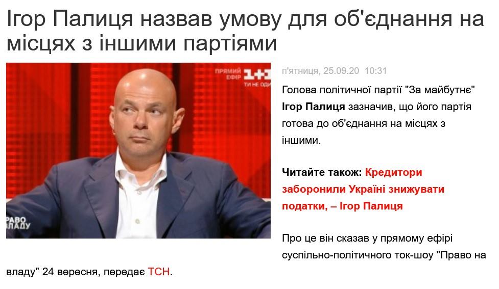 Приклад матеріалу із ознаками замовності можна побачити і в заголовку «Ігор Палиця назвав умову для об’єднання на місцях з іншими партіями». Текст містить ознаки агітації, оскільки у новині посилаються на слова голови політичної партії «За майбутнє» Ігоря Палиці, що його партія готова до об’єднання на місцях з іншими. А матеріал про політика Андрія Покровського із заголовком «Інвестиції, стратегія розвитку, здоров`я лучан: назвали пріоритети «СВІДОМИХ» мав би бути позначений як рекламний.
