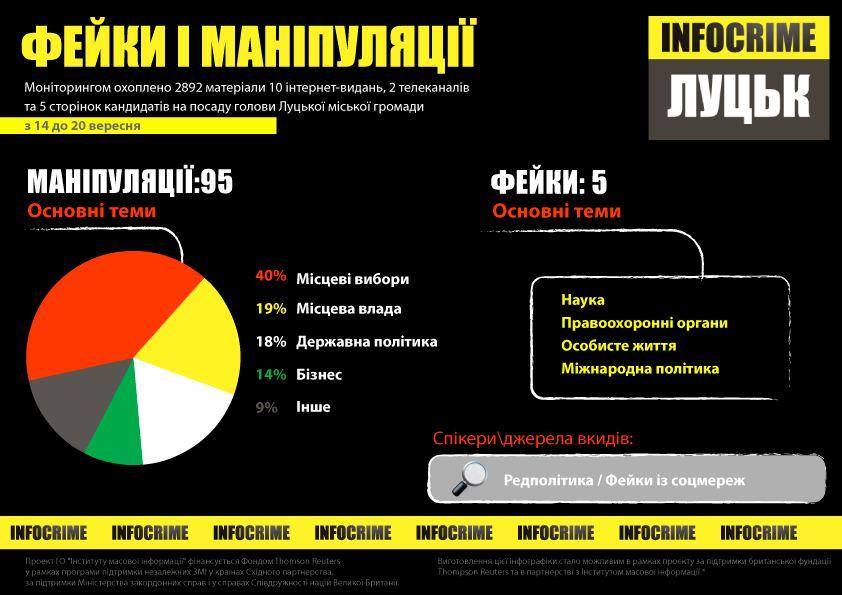 *До вибірки потрапили 2892 матеріали 10 інтернет-сайтів (Волинські новини, ВолиньPost, Волинь24, Район.in.ua, Волинь.UA, Конкурент, Перший, Під прицілом, Буг, Твій портал) та двох телеканалів – 12 канал і ТРК «Аверс». Період моніторингу – 14-20 вересня 2020 року. З методологією дослідження можна ознайомитися за посиланням.