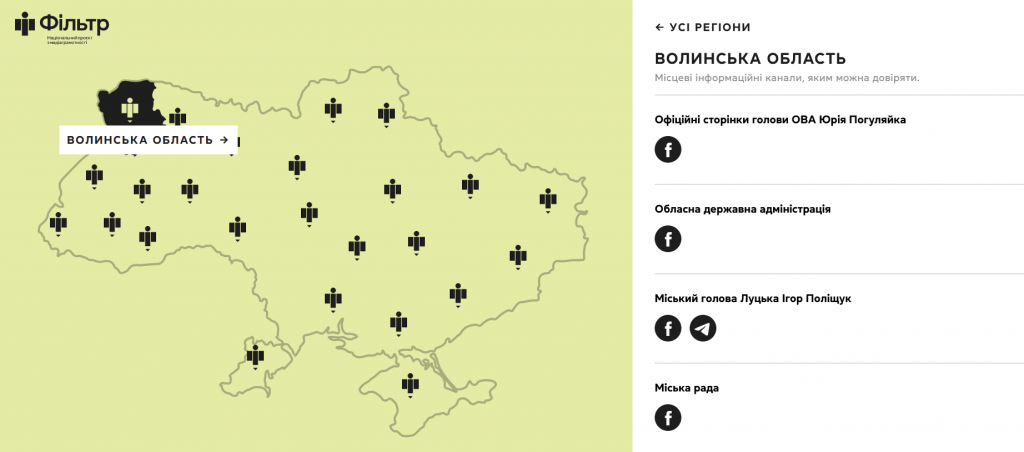 Також в рамках національного проєкту з медіаграмотності Міністерства культури та інформаційної політики України створили мапу надійних джерел інформації у регіонах. На Волині до таких вже віднесли офіційну сторінку голови ОВА Юрій Погуляйка та самої адміністрації, сторінки міського голови Луцька Ігоря Поліщука та міської ради, «Суспільне. Волинь», «Волинські новини», «Силу правди», Район.in.ua, «Перший».