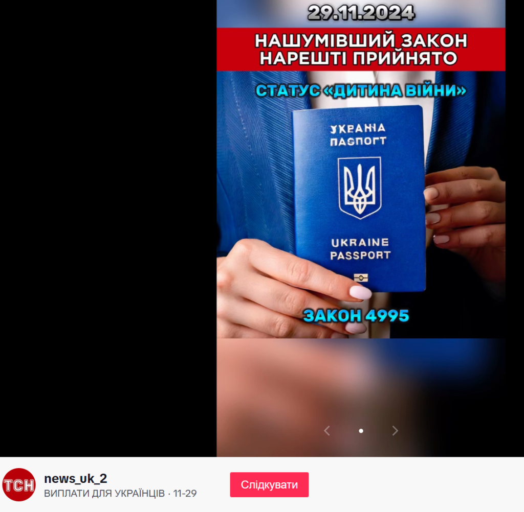 У тіктоці в листопаді 2024 року поширювали відео, що нібито з 27 листопада 2024 року вступає в силу закон №4995 про новий статус «дитини війни». Відео було озвучене голосом штучного інтелекту, що нагадує голос когось з ведучих новин.