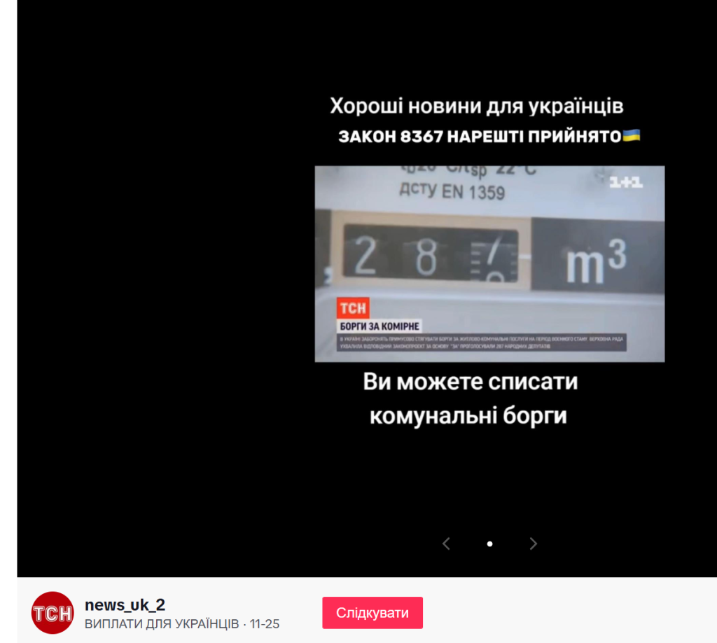 Наприклад, на сторінці news_uk_2 поширювали фейкове відео, що нібито завдяки закону №8367 можна списати борги за комунальні платежі. У відео голос штучного інтелекту озвучує текст та до картинки додана плашка «ТСН». Звісно ж, це не відео цього телеканалу.