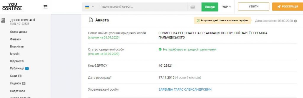 За даними аналітичної системи YouControl, Волинська регіональна організація політичної партії «Перемога Пальчевського» зареєстрована у Луцьку в листопаді 2015 року. Щоправда, спочатку була регіональною організацією політичної партії «Україна завтра», а згодом була перейменована. У реєстрі міститься контактний номер телефону, за яким «Сила правди» спробувала сконтактувати з представниками партії на Волині.