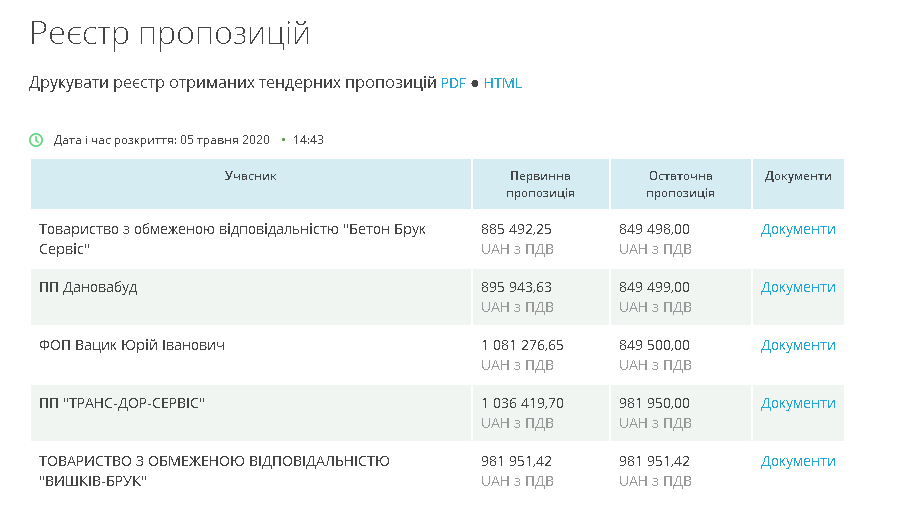 Очікувана вартість ремонту доріжки на дамбі вздовж річки Стир становила 3,5 мільйона гривень. На конкурс надійшли пропозиції від двох учасників: ТОВ «Бетон Брук Сервіс» та ПП «Спортелітбуд». На аукціоні ціни конкурентів не знижувались, в результаті переможцем стало ТОВ «Бетон Брук Сервіс» із ціною – 2 974 989, 50 грн.