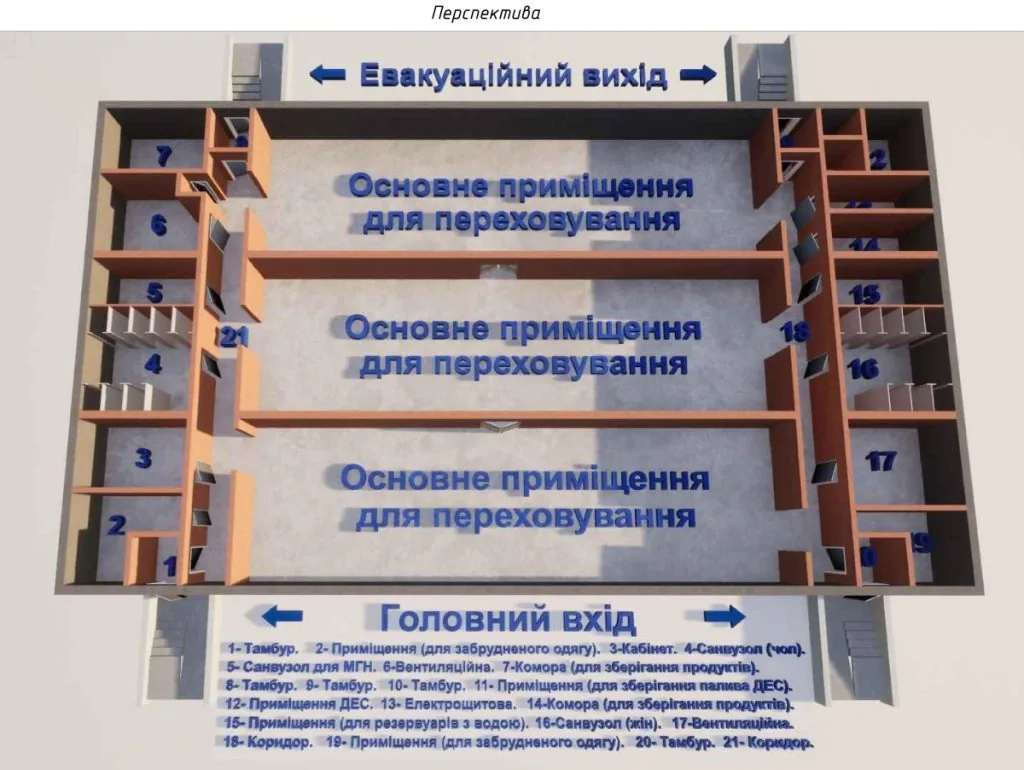 Згідно з технічним завданням підрядник має спорудити укриття площею 1000 квадратних метрів із залізобетонними стінами та перекриттями, герметичними та протипожежними дверима. До приміщення мають бути підведені водопостачання та каналізація. Споруда буде оснащена вентиляційними та протипожежними системами. Там також має бути встановлена система відеоспостереження та точки доступу Wi-Fi.