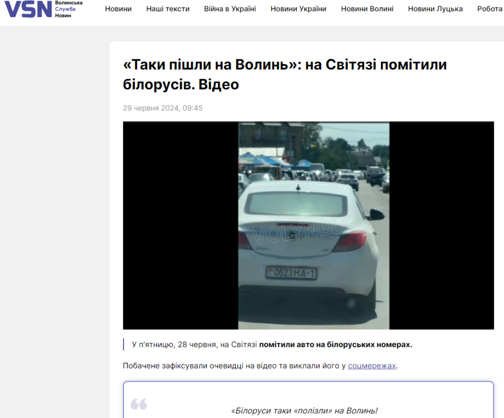 «Таки пішли на Волинь»: на Світязі помітили білорусів. Відео», — така новина з’явилася на сайті Волинська служба новин наприкінці червня. Така назва новини одразу ж наштовхує на спогади про 2022 рік та про ймовірний наступ російських військ зі сторони Білорусі. Але ця новина створена на основі того, що у селі Світязь люди 28 червня побачили одне авто на білоруських номерах.