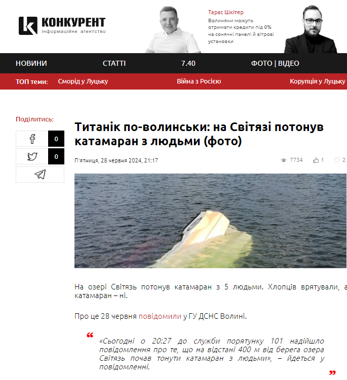 На сайті «Конкурент» вийшла новина 28 червня про те, що відпочивальники опинилися у воді з назвою «Титанік по-волинськи: на Світязі потонув катамаран з людьми (фото)» з маніпуляційними перебільшеннями. Люди у воді не потонули, а катамаран називати титаніком — це занадто.