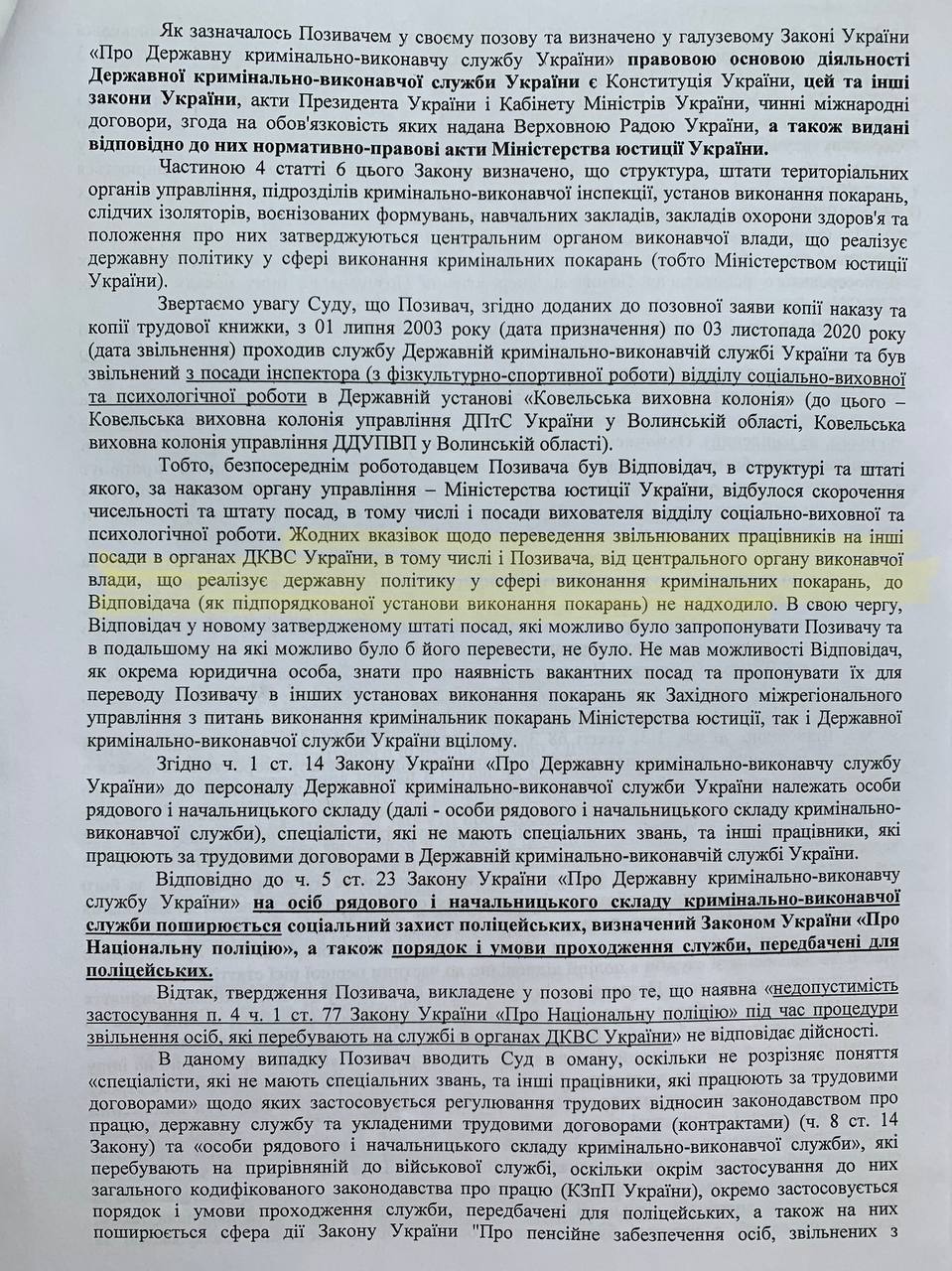 «Відповідач міг би вжити заходів щодо працевлаштування Позивача в порядку переміщення його на іншу посаду в структурі Департаменту з питань виконання кримінальних покарань з підстав, зазначених у статті 65 Закону України “Про Національну поліцію”», — каже Юлія Петрук.