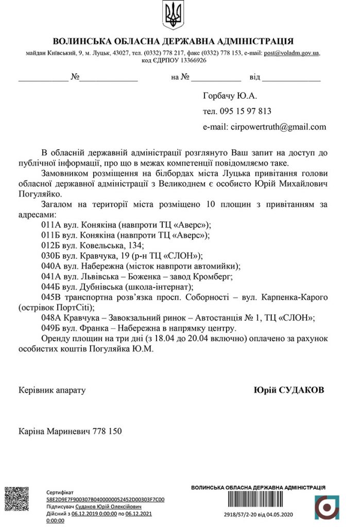 У відповіді за підписом керівника апарату ОДА Юрія Судакова повідомили, що для привітання голови орендовано 10 рекламних площ на вулицях Конякіна, Ковельській, Кравчука, Набережній, Львівській, Дубнівській, Соборності, Івана Франка. Сам посадовець за три дні оренди (з 18.04 до 20.04) і заплатив.
