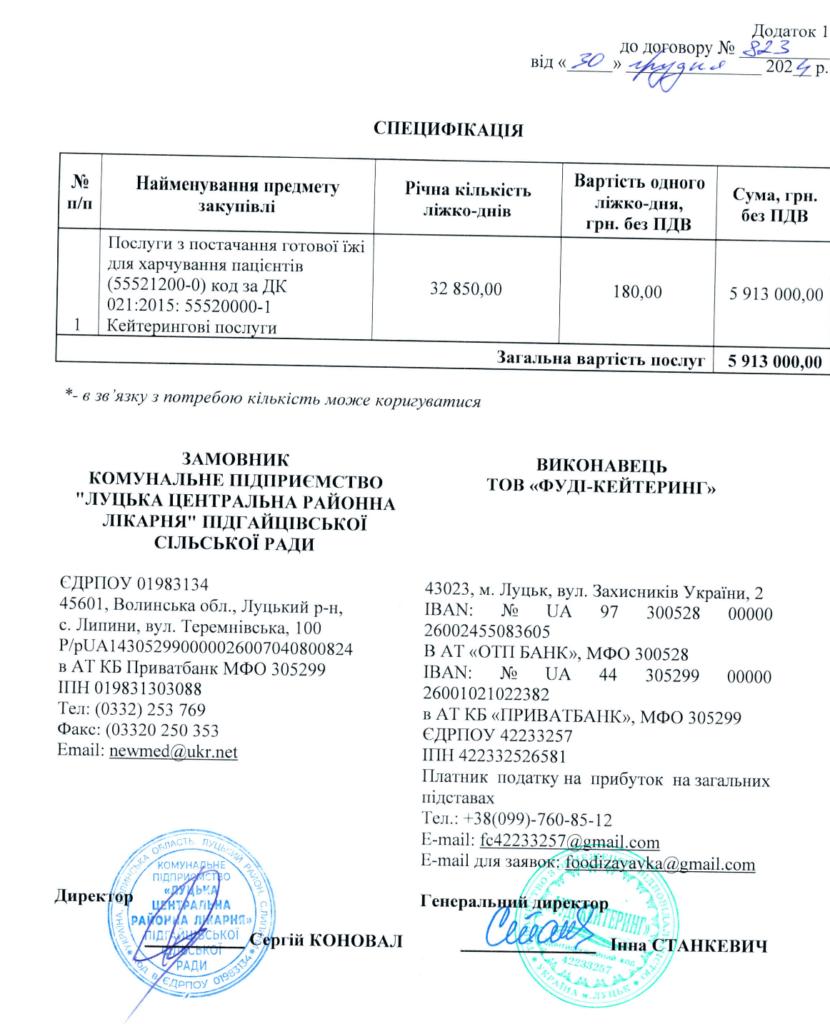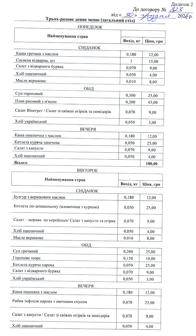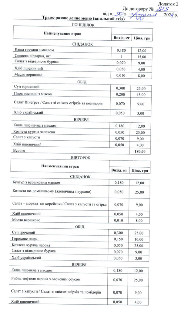З 1 січня до 31 грудня 2025 року підрядник повинен забезпечити сім днів на тиждень пацієнтів лікарні триразовим харчуванням. Згідно з договором, за рік медзаклад планує харчувати пацієнтів з розрахунку на 32 тисячі 850 ліжко-днів, вартістю 180 гривень за один.